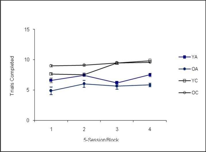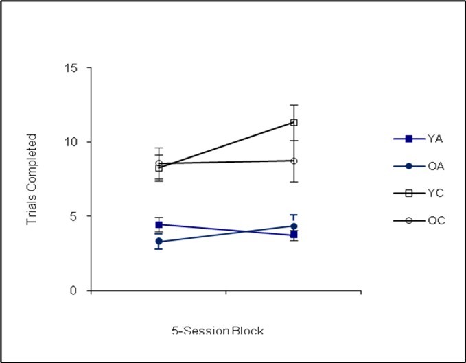 The statistical results did not indicate a main effect of age, F(3,30)=1.84, p=0.16, Cohen’s f=0.14. The main effect of 5-session block was also not statistically significant, F(3,30)=1.59, p=0.12, Cohen’s f=0.10. The results showed an overall interaction between genotype by age, F(3,30)=5.10, p=0.01, Cohen’s f=0.18, but subsequent univariate analyses showed that none of the differences reached statistical significance for the individual dependent variables (all Fs<3.20, all ps>0.05).